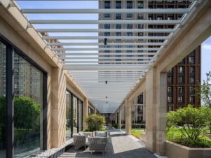 Приватная территория "Интонации" разделена на две тематические зоны: внутренний двор с детскими и спортивными площадками и ландшафтный сад на террасе. Главным акцентом стал парящий водоем с подвижной гладью.