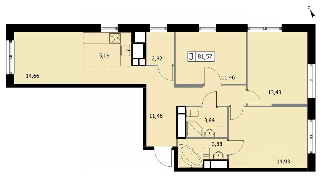 Просторная и светлая квартира площадью 81,8 кв. м. Продуманная планировка квартирывключает в себя отдельное расположение спальни от обеденно - гостиной зоны. Из оконгостиной открывается вид на Останкинскую башню, колесо обозрения и другие высотные