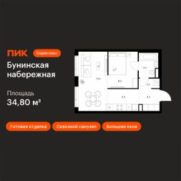 Продаётся 1-комн. квартира площадью 34,8 кв.м на 13 этаже 16 этажного дома (Корпус 2.6/1.4, Секция 4) проекта ПИК Бунинская набережная. Светлый просторный подъезд на уровне земли, функциональная планировка, большие окна, c отделкой.