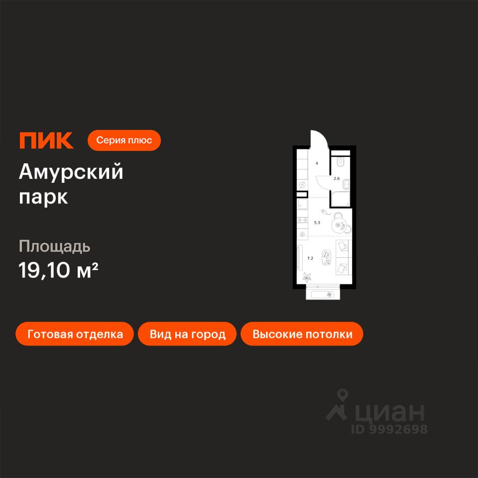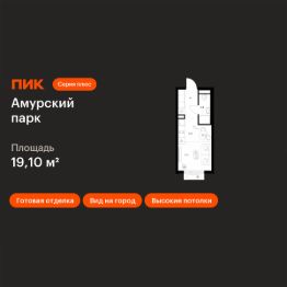 Продаётся квартира-студия площадью 19,1 кв.м на 19 этаже 19 этажного дома (Корпус 4.4, Секция 5) проекта ПИК Амурский парк. Светлый просторный подъезд на уровне земли, функциональная планировка, большие окна, c отделкой.