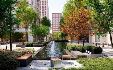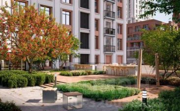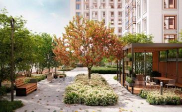 Пространство дворов спроектировано в стиле пэчворк, с каменными садами, взрослыми деревьями и кустарниками. Современные детские площадки, размещенные на территории комплекса, были разработаны совместно с психологами. Для жителей первой очереди на крыше торгово-развлекательного центра спроектирован приватный двор-сад с коворкингом, детской зоной, песочницей и местом для отдыха с лежаками.