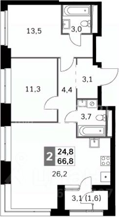Квартира с отделкой whitebox, общей площадью 67.2 м2.