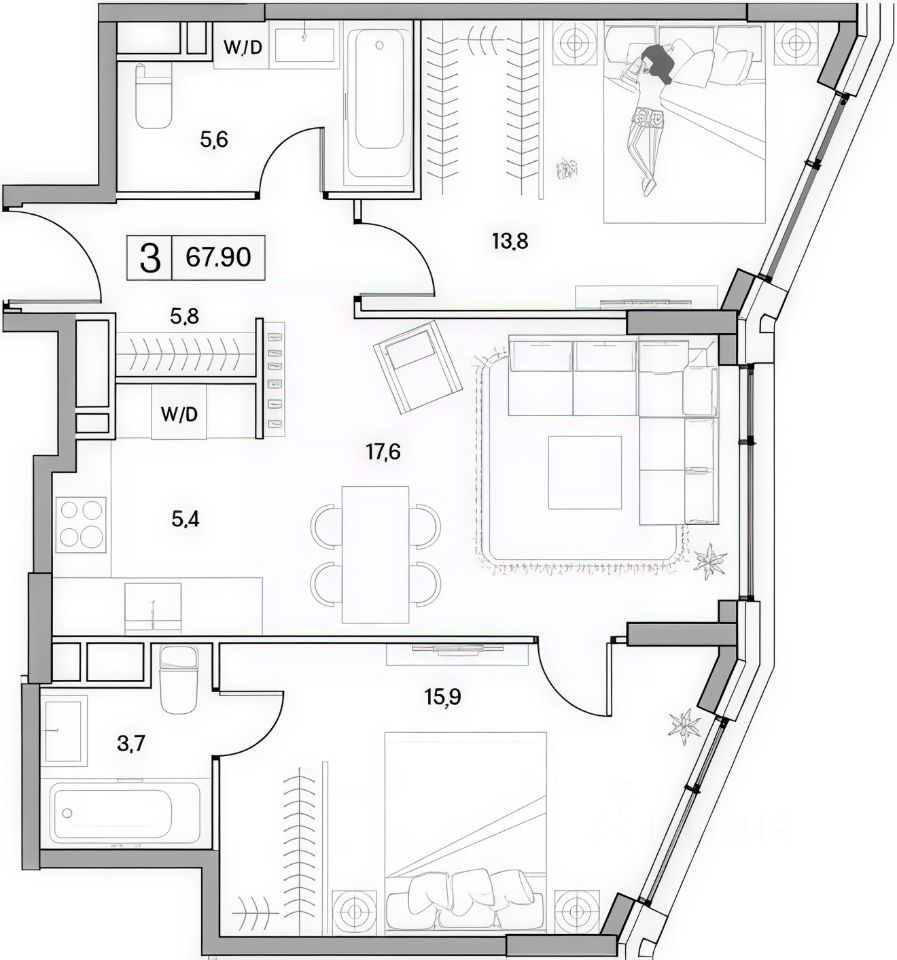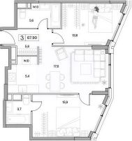 Площадь квартиры 67.9 м, кухня-гостиная 23 м.