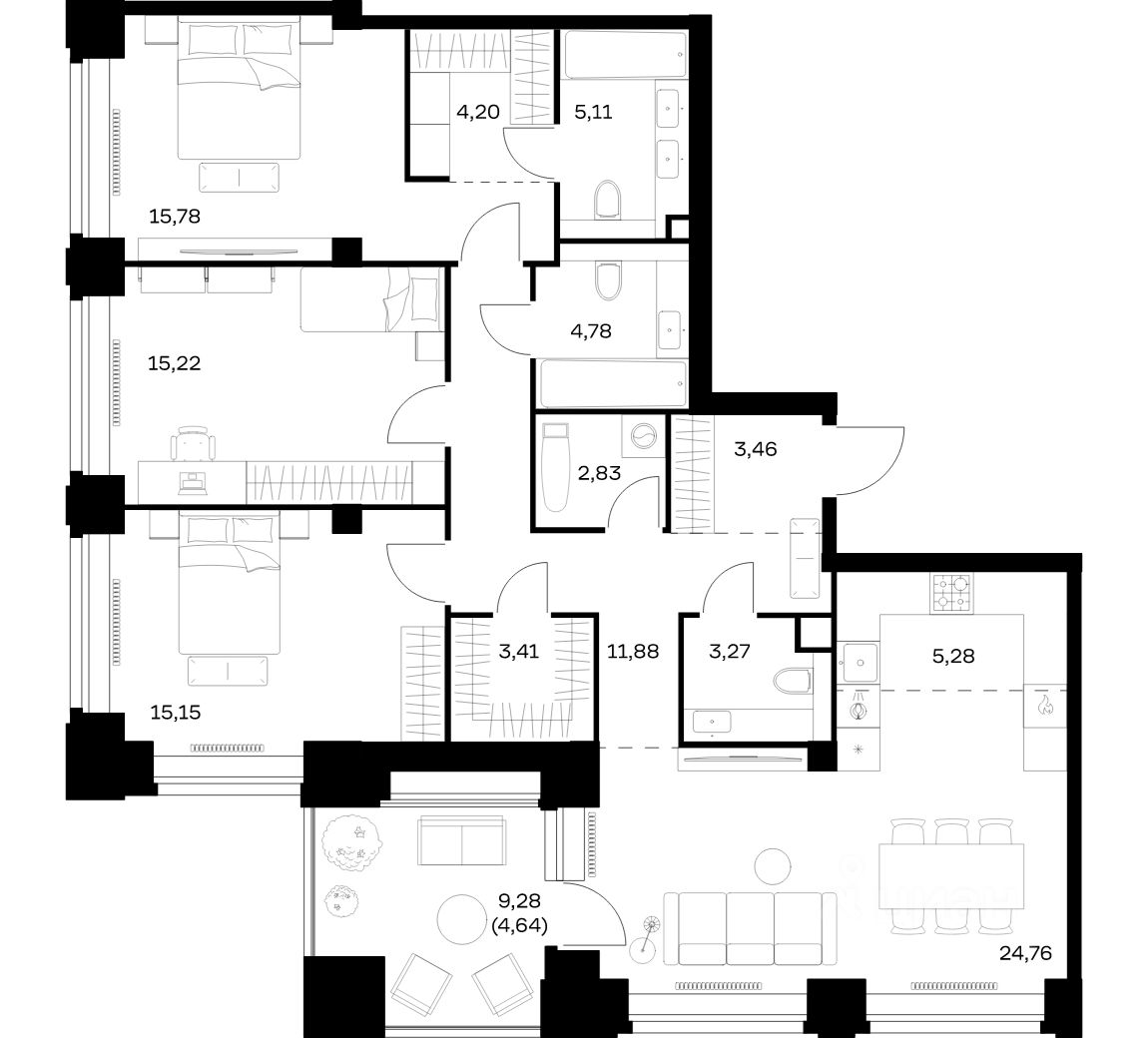 Строим кварталы для жизни с заботой о будущем. Предлагается 3-комнатная квартира премиум-класса площадью 119,77 кв.м в корпусе 3 на 35-м этаже, в жилом комплексе "NOVA".