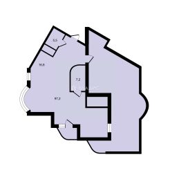 Общая площадь квартиры составляет 219 квадратных метров, из которых 97.2 квадратных метров — жилая площадь+ 90 кв.м. -терраса. Кухня площадью 16.6 кв.м.. Высота потолков достигает 3 метров. Окна выходят на улицу. Объект -без отделки.