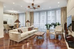 Выполнена отделка в стиле современной классики, квартира меблирована и оснащена качественной бытовой техникой.