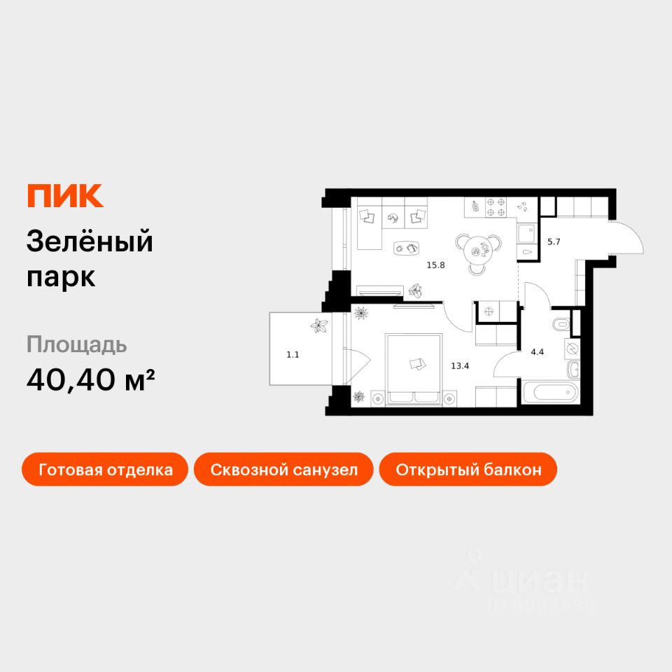 Продаётся 1-комн. квартира площадью 40,4 кв.м на 4 этаже 28 этажного дома (Корпус 5.4, Секция 5) проекта ПИК Зелёный парк. Светлый просторный подъезд на уровне земли, функциональная планировка, большие окна, c отделкой.