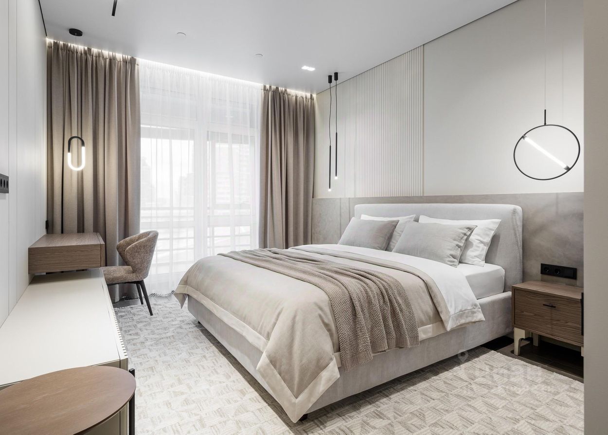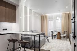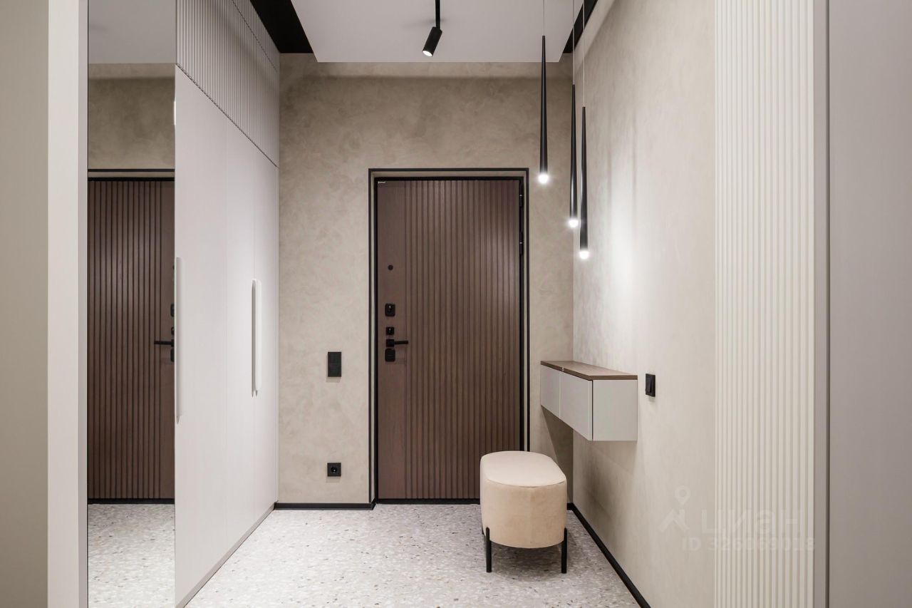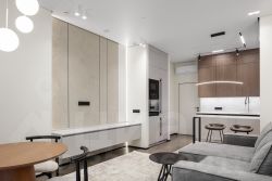 Для создания чистых, непрерывных линий в интерьер интегрированы межкомнатные двери-невидимки Invisible Doors, а безопасность входа в апартаменты обеспечивает входная дверь Гардиан. Натяжные потолки с парящим эффектом и изысканной контурной подсветкой со строгими алюминиевыми плинтусами, завершают образ современного и эксклюзивного жилья.