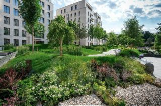 В саду высажены многолетние деревья, различные виды кустарников, цветов и трав, обустроены зеленые аллеи, лаунж-зоны, фонтан, и детская площадка от немецкой компании Richter Spielgeraete.
