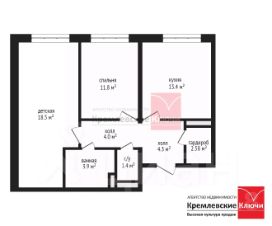 Квартира с функциональной планировкой, окна смотрят во двор, общей площадью 59.5 кв.м, две изолированные комнаты 18.5 кв.м и 11.8 кв.м, просторная кухня 13.4 кв.м, санузел, постирочная, гардеробная, просторная прихожая.
