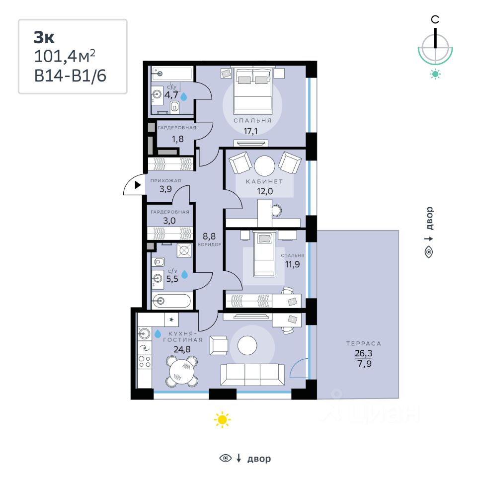 В продаже — трехкомнатная квартира с чистовой отделкой, общей площадью 101,4 кв. м. Квартира расположена на первом этаже десятиэтажного корпуса Балансд в квартале В14 нового района СберСити, который строит Сбер.