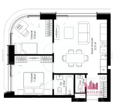 Планировка квартиры - кухня + гостиная, гостевой санузел, + мастер спальня с санузлом, есть возможность оборудовать гардеробную!