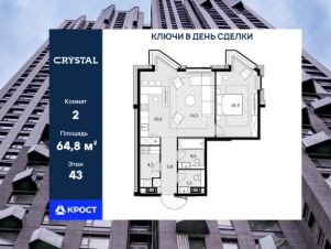 Однокомнатная квартира площадью 64,8 кв.м. на 43 этаже дома бизнес-класса "CRYSTAL Трилогия".