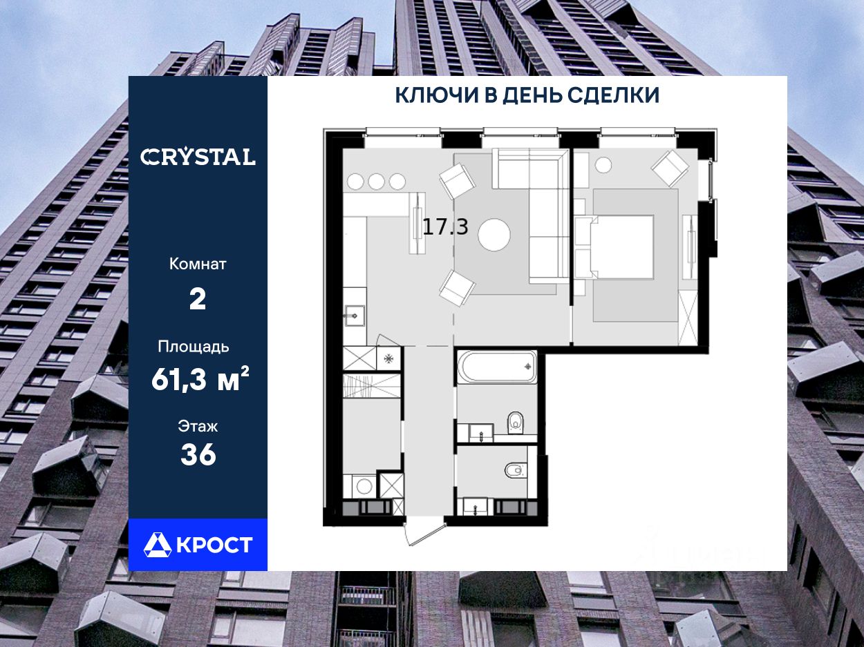 Однокомнатная квартира площадью 61,3 кв.м. на 36 этаже дома бизнес-класса "CRYSTAL Трилогия".