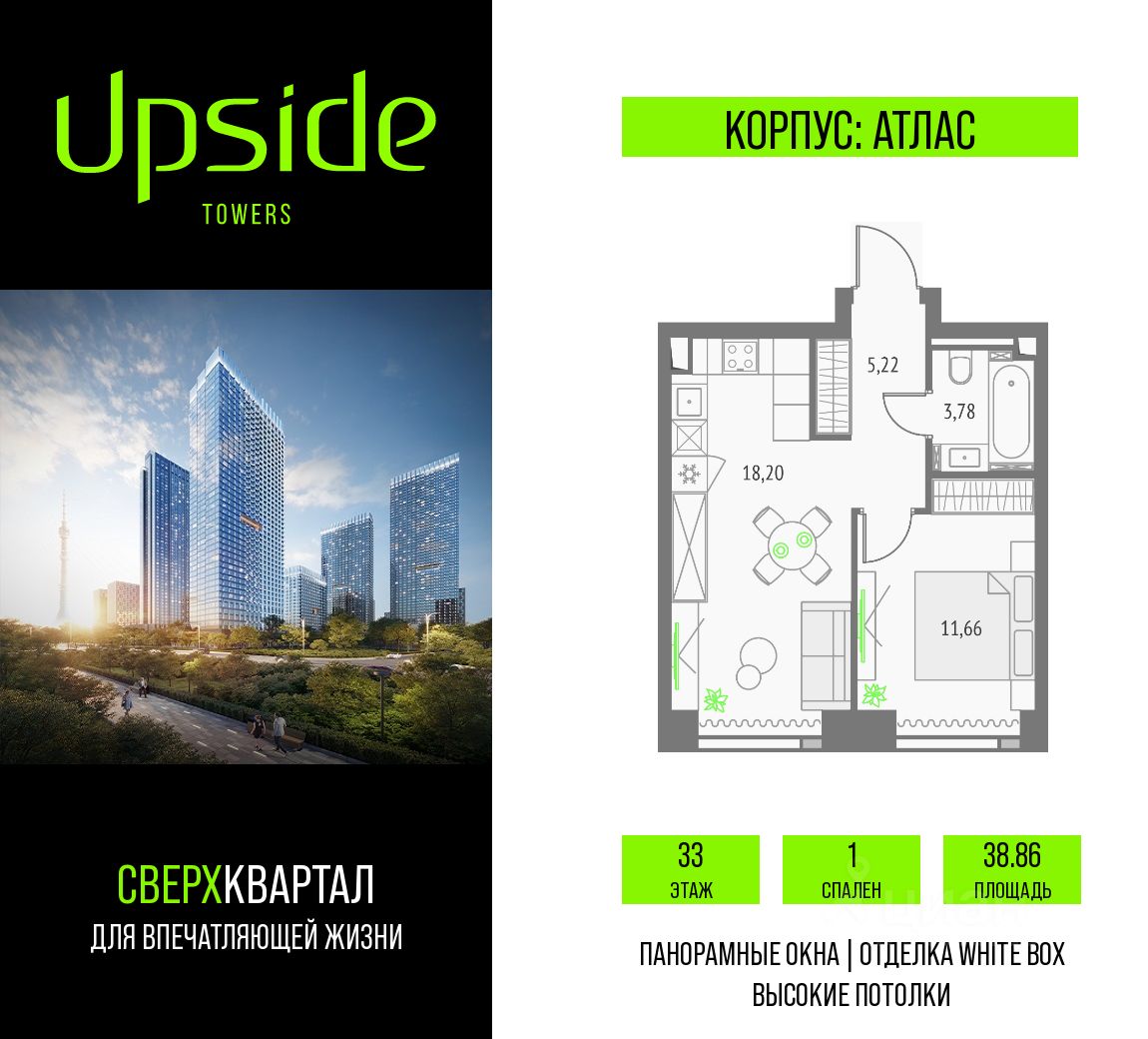 Upside Towers - технологичный квартал строится в динамично развивающемся Бутырском районе, в 3 мин. от метро, в 5 мин. от ТТК. На территории 7 га возводится 5 высотных башен от 19 до 58 этажей, названных в честь главных вершин земли. Квартиры с панорамными окнами в пол, высокими потолками и современными инженерными решениями. Благоустроенная зеленая территория включает: приватные дворы, природный комплекс, прогулочный бульвар, ландшафтный парк 2,5 га с сенсорным садом и многофункциональными игровыми и спортивными площадками.