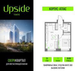 Продаётся 1-комнатная квартира площадью 38.86 кв.м на 33 этаже 47 этажного корпуса Атлас в квартале небоскребов "Upside Towers". В квартире отделка White-box, c видом на внутренний двор, ландшафтный парк, парк Сокольники. Номер квартиры Б3309.
