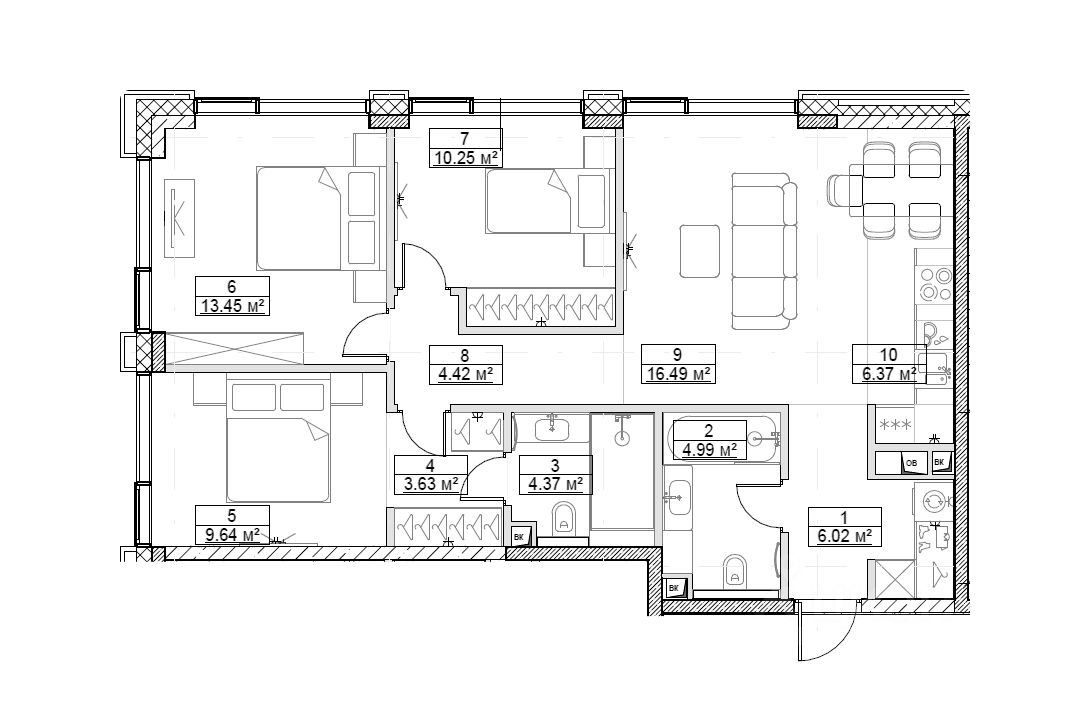 Продаётся 4-х комнатная квартира евро формата с просторной кухней-гостинной, двумя совмещенными санузлами, мастер-спальней, и отделкой whitebox:
