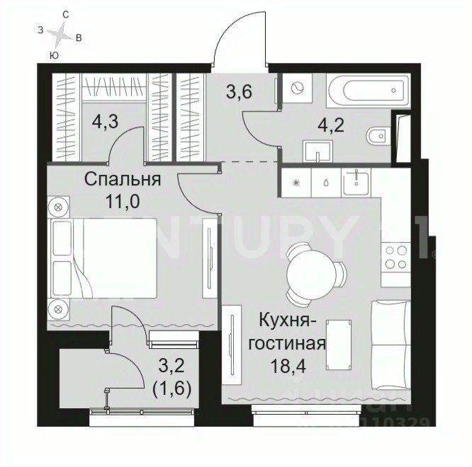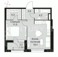 Квартира с отделкой whitebox, общей площадью 43.1 м2. Есть лоджия. В спальне предусмотрена гардеробная.