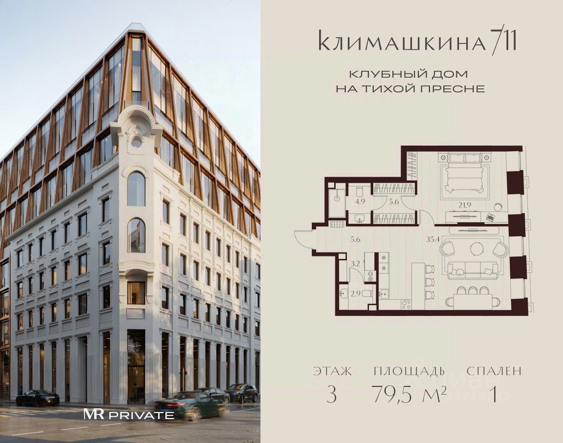 Старт продаж в новом клубном доме Климашкина 7/11 Продаётся 1-комнатная квартира общей площадью 79.50 м². Климашкина 7/11 — клубный семейный дом с ультрасовременной архитектурой, в которую оправлена антикварная редкость — полностью сохраненный фасад особняка XIX века. В проекте всего 46 резиденций — ни одной лишней, ни одной случайной. На этаже — от двух до четырех квартир, что создает исключительную приватность, редкую даже для элитного сегмента. Окружение Расположенный в тихом интеллигентном квартале Пресненского района, клубный дом Климашкина 7/11 соседствует со знаковыми зданиями старой Москвы Пресненского района. Всего в нескольких шагах находится памятник конструктивизма Центр Зотов, мастерская Зураба Церетели и Римско-католический кафедральный собор, а также в пешей доступности — Музей русского импрессионизма, парк Красная Пресня и Патриаршие пруды, Театр Сатиры и Московский Зоопарк. Транспортная доступность — 5 минут до Садового кольца; — 5 минут до ТТК; — 10 минут до Делового центра; — 12 минут до Белорусского вокзала; Внутренняя инфраструктура — Просторное дизайнерское лобби с потолками до 5 м; — Собственный приватный ландшафтный сад от L. BURO; — 2-х уровневый подземный паркинг на 55 машино-мест; — Собственный SPA и фитнес-центр; — Умные системы безопасности и сервис самого высокого уровня.