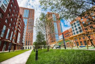 Закрытый двор без машин, с охраняемой территорией.