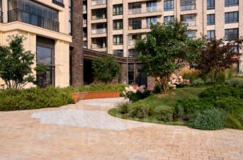 Обустроенная придомовая территория, закрытый двор без машин, открытая парковка и подземный паркинг, безбарьерная среда с входными группами без ступенек и бордюров.