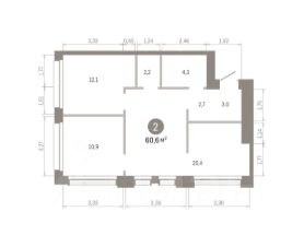 Квартира с кухней-гостиной и двумя спальнями в Доме "А". Особенности планировки: без отделки, окна на две стороны, постирочная. Срок сдачи IV кв. 2027