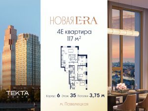 4-комн. квартира в ЖК "Era" на 35 этаже в 37 этажном здании Корпус 6. Общая площадь: 117 кв.м., жилая: 75.00 кв.м. Высота потолков 3.75 м.