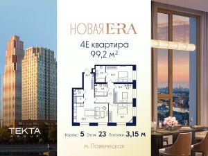 4-комн. квартира в ЖК "Era" на 23 этаже в 52 этажном здании Корпус 5. Общая площадь: 99.2 кв.м., жилая: 60.50 кв.м. Высота потолков 3.15 м.