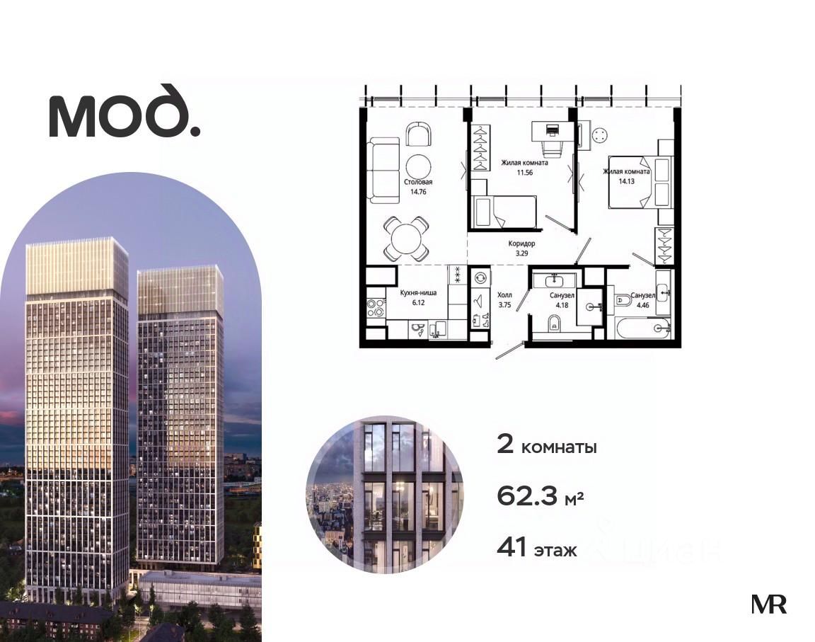 Продается 2-комнатная квартира общей площадью 62.30 м² без отделки в ЖК премиум-класса Мод на 41-м этаже 44 этажного дома.