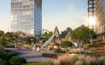 - Центральный сад с выразительным рельефом и парящим пешеходным мостом