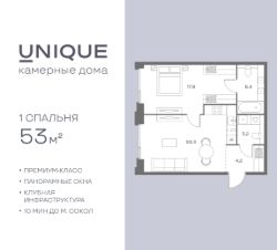 Продается 1-к. квартира номер 138 общей площадью 53 кв.м. на 5-м этаже 7 этажного дома, корпус UNIQUE (премиум-класс). Без отделки.