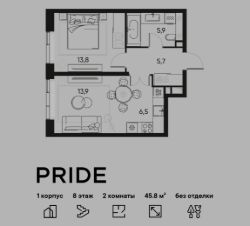 В премиальном жилом квартале PRIDE продается 2-комнатная квартира в 1 корпусе, на 8 этаже, в секции 6. Её общая площадь составляет 45.8 м². Пространство включает 1 уютную спальню 13,8 м², просторную кухню-гостиную 20,4 м² и ванную комнату 5,9 м². Ключи в 2026 году.