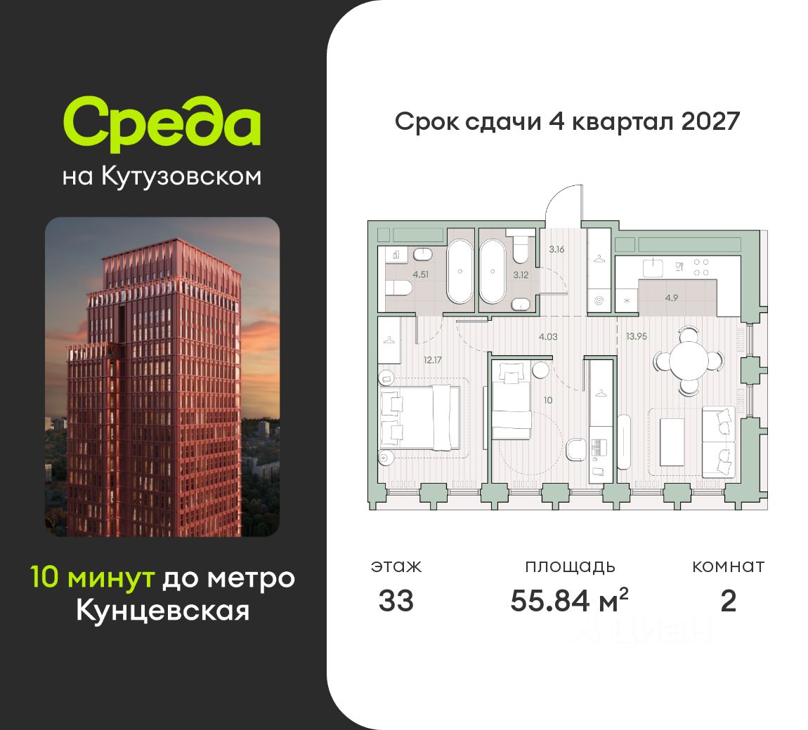 Продаётся 2-комнатная квартира общей площадью 55.84 кв.м. с отделкой white box. Квартира расположена на 33 этаже корпуса 4.1 в жилом комплексе бизнес-класса "Среда на Кутузовском" в пешей доступности от метро "Кунцевская".