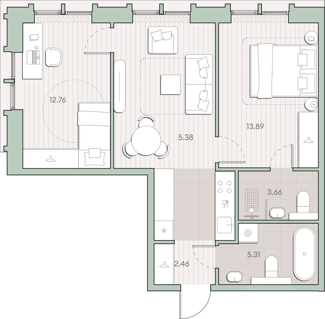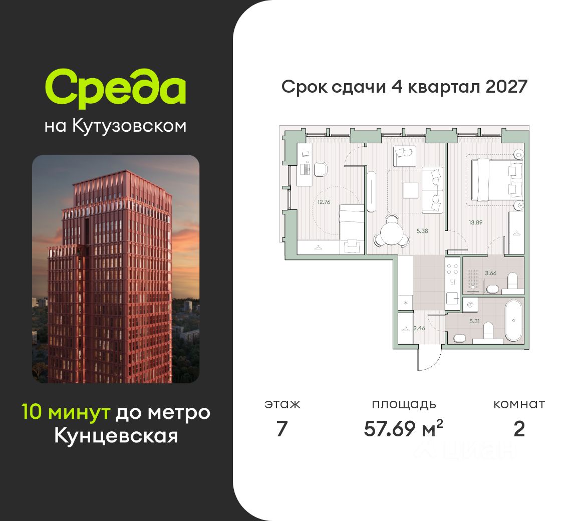 Продаётся 2-комнатная квартира общей площадью 57.69 кв.м. без отделки. Квартира расположена на 7 этаже корпуса 4.2 в жилом комплексе бизнес-класса "Среда на Кутузовском" в пешей доступности от метро "Кунцевская".