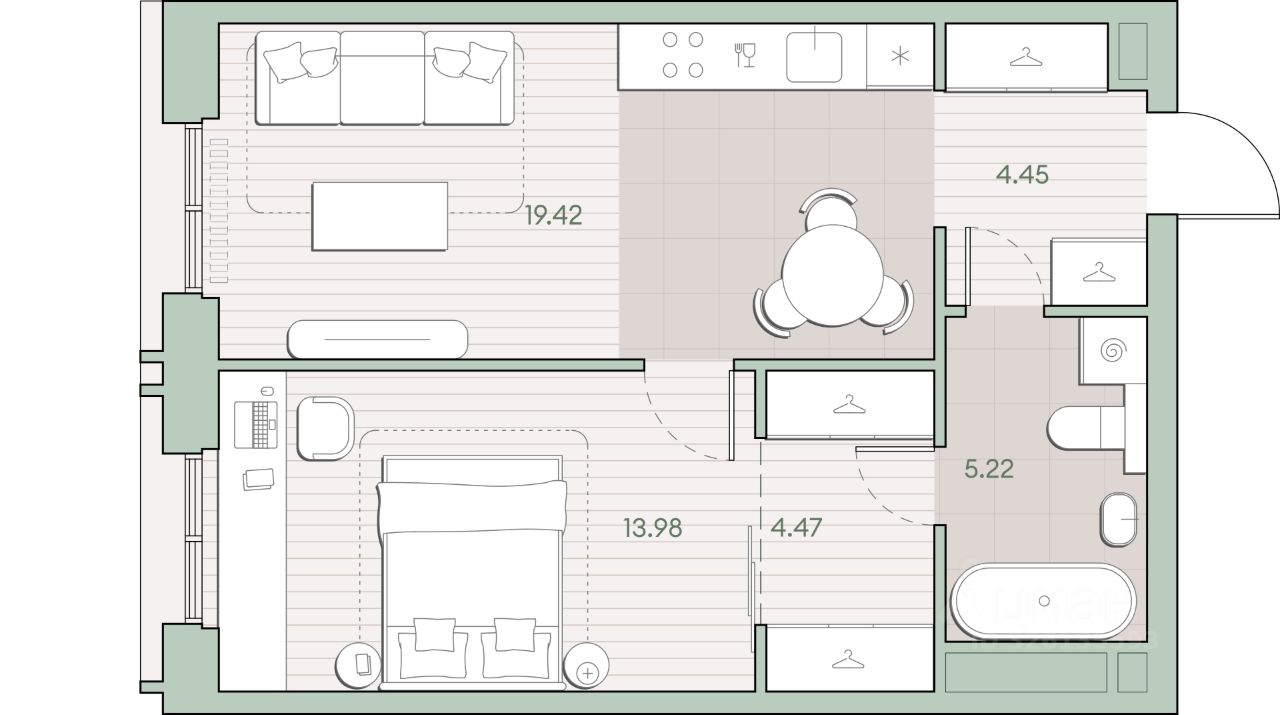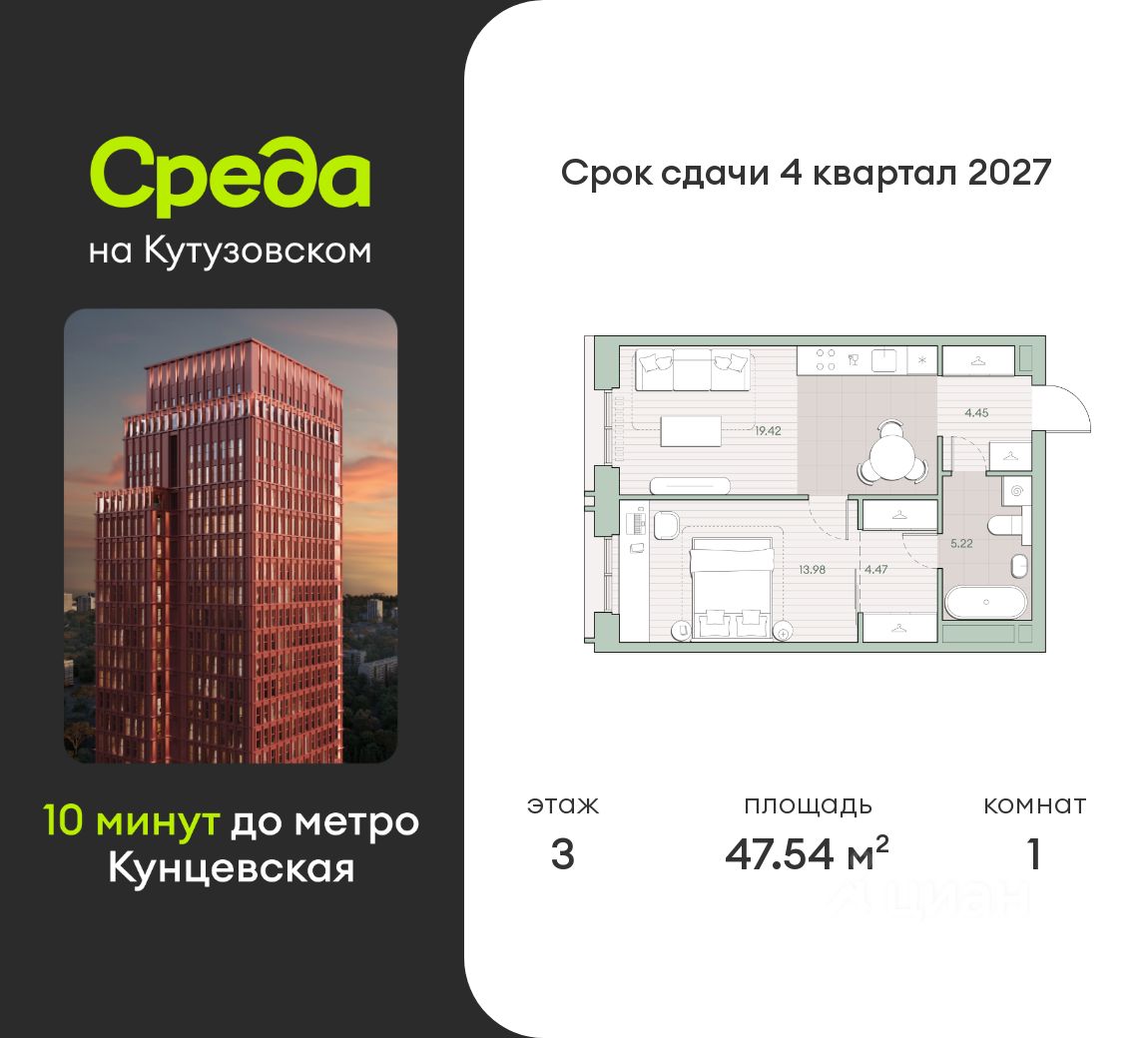Продаётся 1-комнатная квартира общей площадью 47.54 кв.м. с отделкой white box. Квартира расположена на 3 этаже корпуса 5 в жилом комплексе бизнес-класса "Среда на Кутузовском" в пешей доступности от метро "Кунцевская".