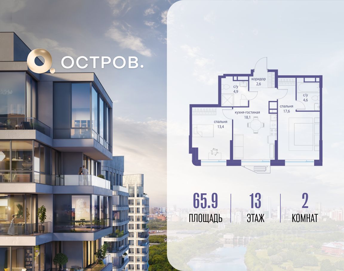 Продаётся 2-комн. квартира от застройщика: общая площадь 65.90 м², жилая м², кухня м², 13-й этаж, жилой квартал "Остров 14", корпус 6 (секция 1). Срок сдачи: 2 квартал 2029 года.