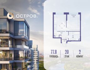 Продаётся 2-комн. квартира от застройщика: общая площадь 77.80 м², жилая м², кухня м², 20-й этаж, жилой квартал "Остров 14", корпус 6 (секция 1). Срок сдачи: 2 квартал 2029 года.