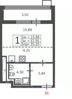 Наличие балкона/лоджии: лоджия. Срок сдачи здания 3 квартал 2026. Состояние квартиры: без отделки. Количество санузлов 1, тип санузла совмещенный. Класс жилья комфорт.