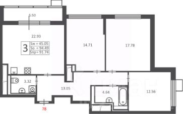 Продается квартира по договору долевого участия, по адресу г. Москва, Полярная улица, земельный участок 16, квартира 78, район Южное Медведково, удобное расположение относительно метро Бабушкинская. Общая площадь составляет 91,74 м², в том числе кухня 22,93 м² и жилая площадь 45,05 м². Количество комнат 3, расположена на 10 этаже из 24.