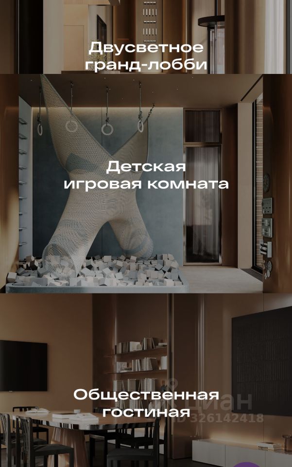 Здесь размещены стойка ресепшен, зоны ожидания, колясочная, фитнес-рум, гостиная и современный коворкинг.