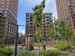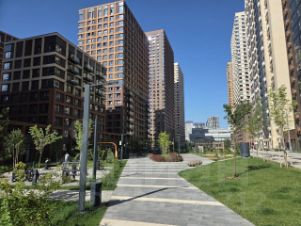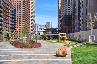 Двор-парк: Закрытая охраняемая территория с ландшафтным дизайном от мирового бюро Gillespies, сухим фонтаном и пешеходным бульваром протяженностью 3 километра.