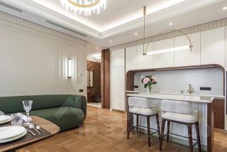 Светлые стены, паркет ёлкой, благородное дерево, латунные детали и изумрудные акценты создают спокойную, но статусную атмосферу, в которую приятно возвращаться каждый день.