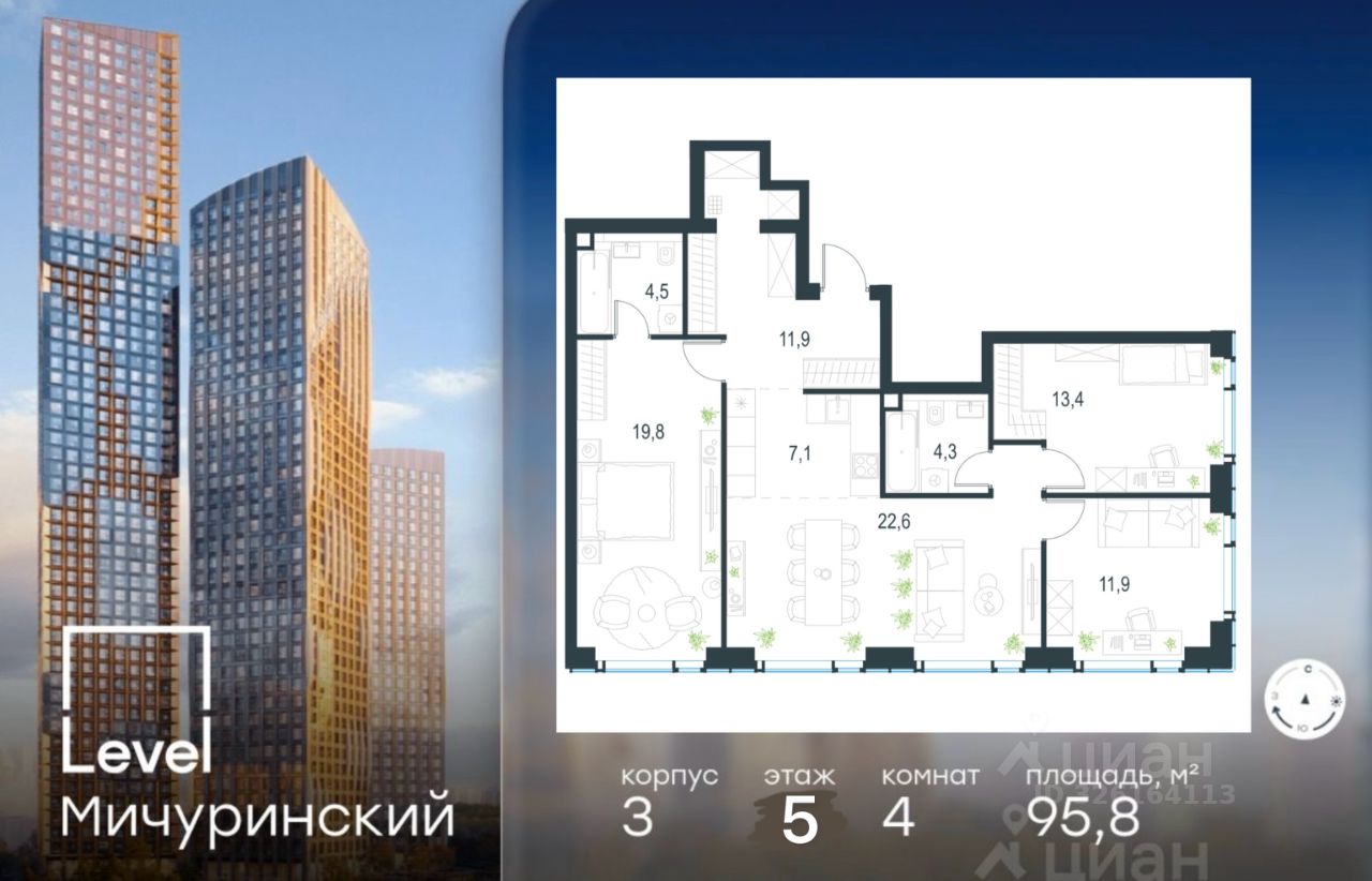 Расположенная на 5-м этаже 30- этажного монолитного здания, квартира общей площадью 96 м порадует вас открытым панорамным видом на храм, пруд и академию ФСБ.