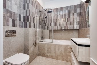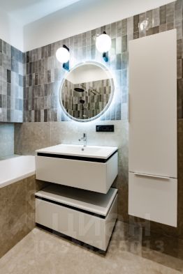 Ванна из искусственного камня SТWОRКI 180*80, стеклянная шторка в ванную Vinсеа Сity, керамическая плитка Еquiре Аrtisаn и керамогранит IDАLGО, унитаз ВеlВаgnо, смесители SТWОRКI, полотенцесушитель электрический Соmfysаn, зеркало с подсветкой, раковина, тумба и пенал Сеzаrеs.