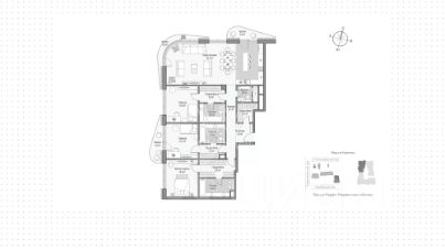 Возможная планировка: кухня-гостиная площадью 55 м², три мастер-спальни с собственными гардеробными и санузлами, гардеробная с постирочной зоной, гостевой санузел и прихожая. Дополнительно спроектировано три балкона, где можно организовать рабочее пространство или место для отдыха, откуда открываются виды в сторону Кремля, на Воскресенскую церковь и благоустроенный ландшафтный двор.