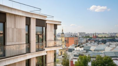 Главное о доме. "Лаврушинский" — три корпуса и несколько вилл делюкс-класса в сердце Якиманки, всего в километре от Кремля. Архитектура бюро SPEECH играет плавными линиями: светлый известняк, тёмный гранит, изогнутые балконы и угловые панорамные окна. В лобби с потолками 4,5 метра гостей встречает консьерж, работает бар с мягкой зоной и отдельные пространства для колясок и велосипедов. В центре комплекса раскинулся парк площадью 1,4 гектара с прудом и фонтаном, тенистыми аллеями, игровыми и спортивными зонами. Для резидентов открыт фитнес-клуб Fit Lab с бассейном на три дорожки и SPA-зоной. Паркинг на два уровня связан с корпусами лифтами.