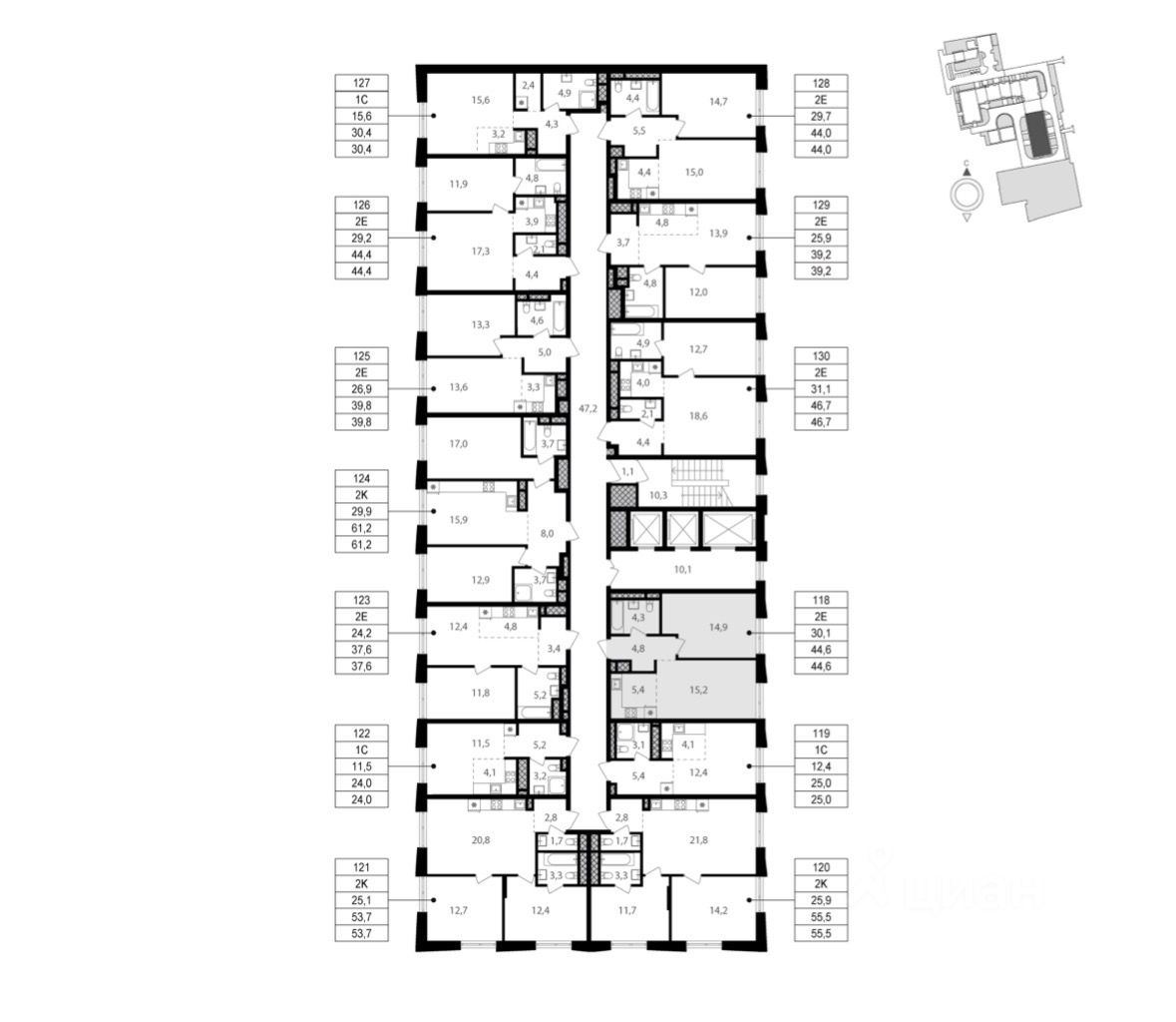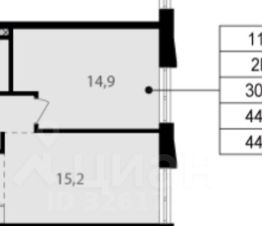 2Е квартира на 11 этаже общей площадью 44,6 кв.м без отделки.