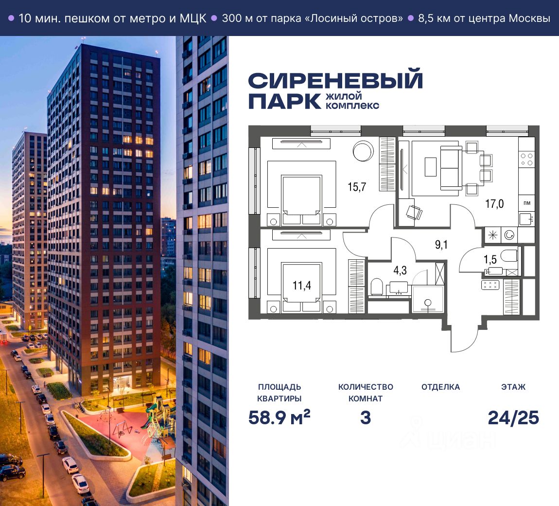 Продаётся просторная 3-комнатная квартира общей площадью 58.9 м² на 24 этаже в новом жилом комплексе "Сиреневый парк", расположенном в Восточном административном округе Москвы на улице Тагильская. Всего 10 минут ходьбы от станции метро "Бульвар Рокоссовского" и одноимённой платформы МЦК.