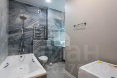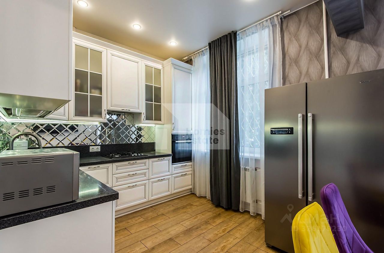 На кухне посудомоечная машина и духовой шкаф Bosch, варочная панель, кондиционер в гостиной. Сделали капитальный ремонт с разводкой электрики. Большая ванная комната с ванной 190 см. Качественные отделочные и черновые материалы: обои Lamborghini, каменная столешница на кухне, латунные трубы коммуникаций и т. д. Теплые полы в прихожей, ванной комнате и на кухне.
