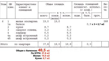 Общая площадь квартиры 40,5 м2 указана с учётом полного размера балкона, площадь по ЕГРН - 37,8 м2.
